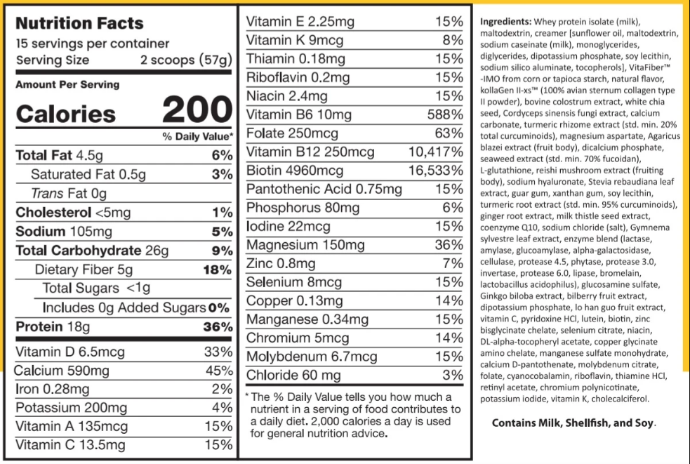 - 900g, 210 calo, 18g protein, 5g chất xơ, 25 vitamin & khoáng chất
